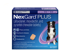NexGard Plus is available in four strengths indicated by color-coded packages. Green: Small dogs (8.1-17 lbs); Yellow: Medium dogs (17.1-33 lbs); Purple: Large dogs (33.1-66 lbs); Red: Extra large dogs (66.1-132 lbs).