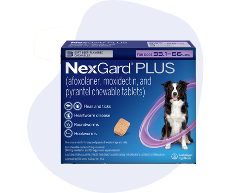 NexGard Plus contains three active ingredients — afoxolaner, moxidectin and pyrantel — to protect against common internal and external parasites.